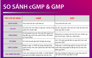 – cGMP (Current Good Manufacturing Practice) là thực hành tốt sản xuất hiện tại được thực thi bởi FDA (Cục quản lý thực phẩm và dược phẩm Hoa Kỳ)